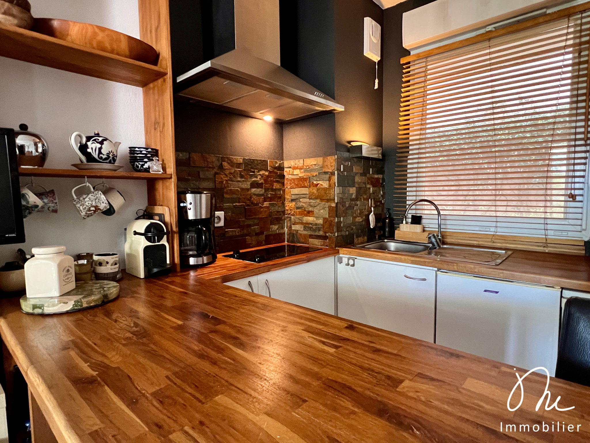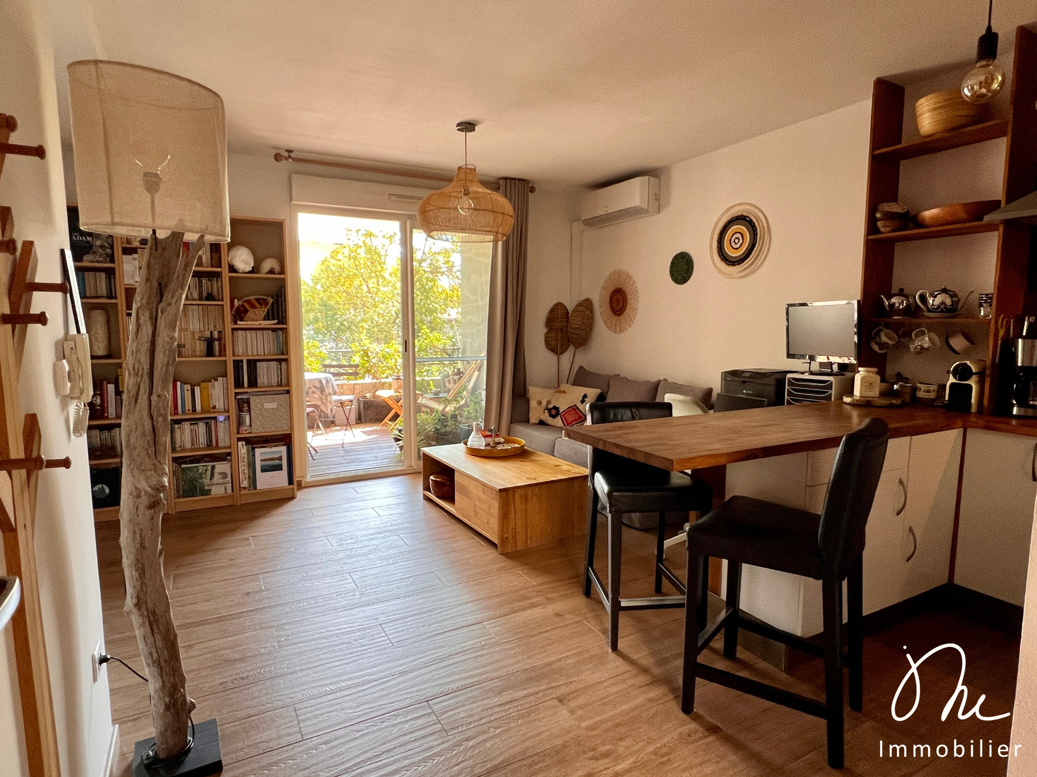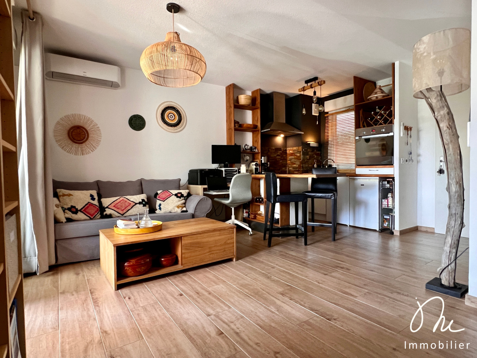 Ses prestations : climatisation dans le séjour, double vitrage, cuisine équipée et des rangements