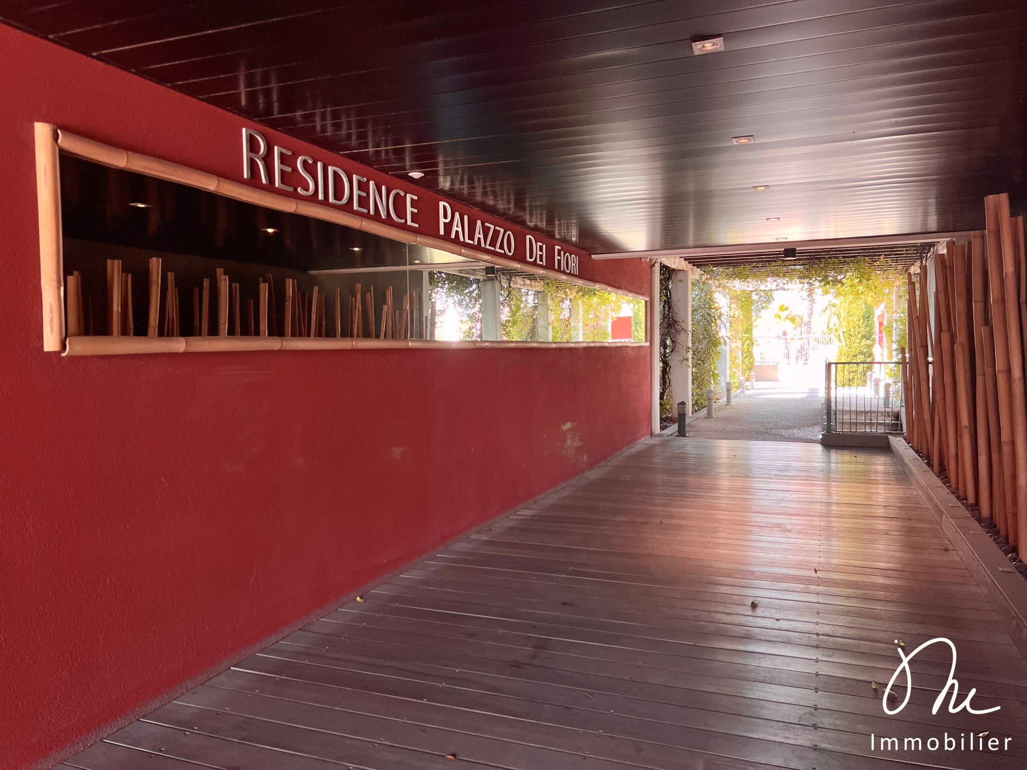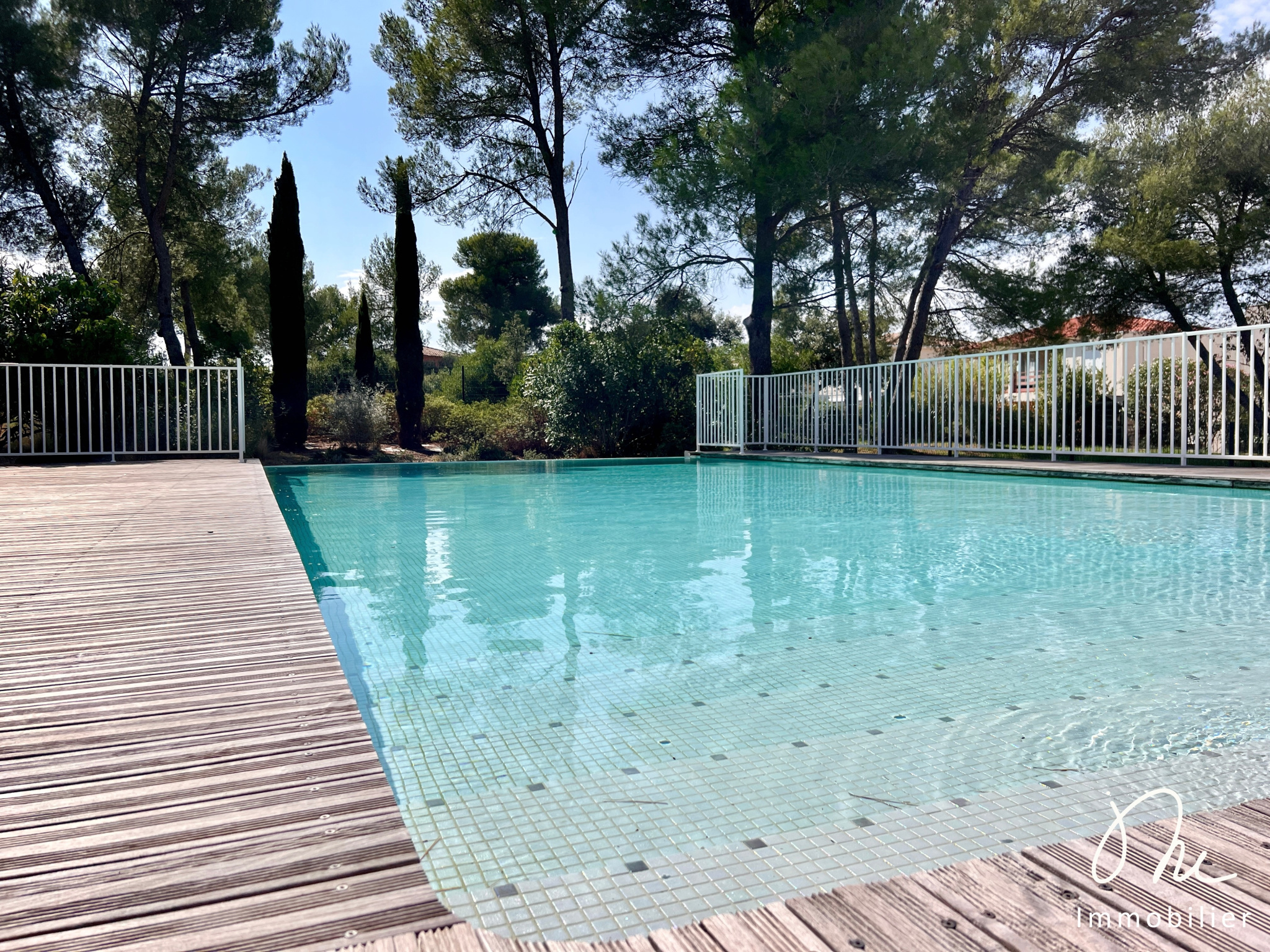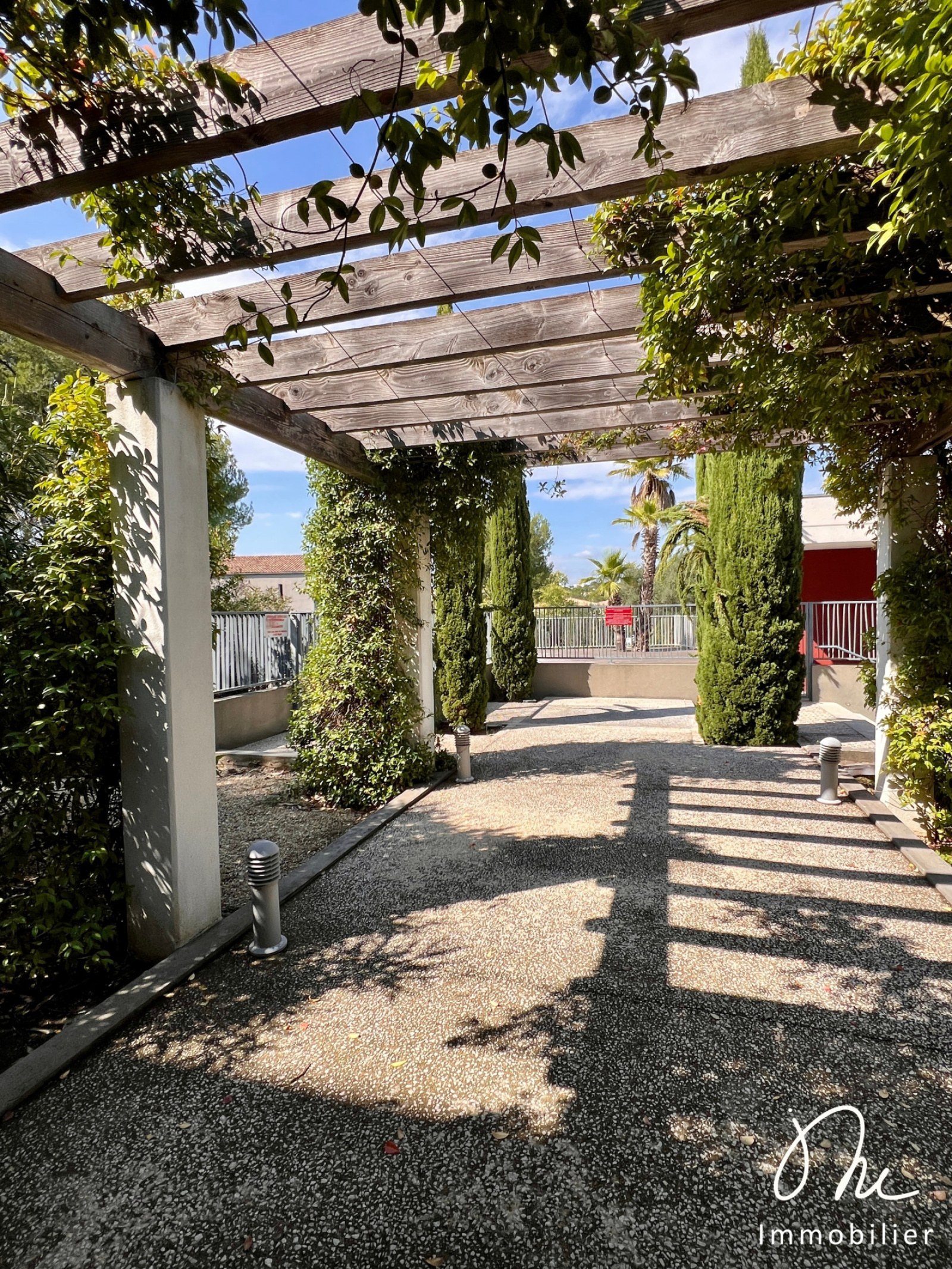 Résidence de stranding : sécurisée avec vidéophone, plusieurs espaces paysagés avec des plantes méditerranéennes et sa piscine accessible uniquement aux résident·e·s et leurs invité·e·s.