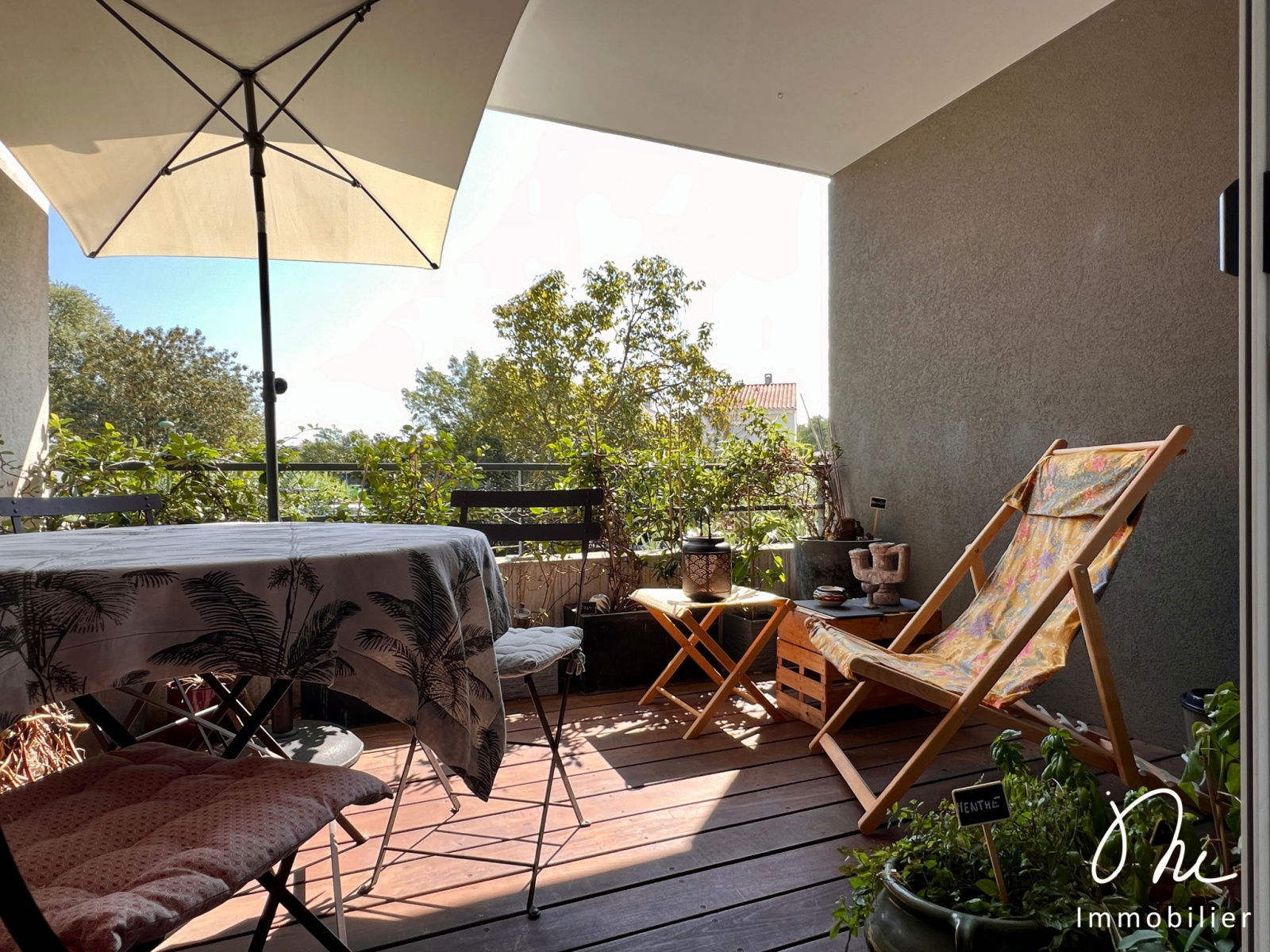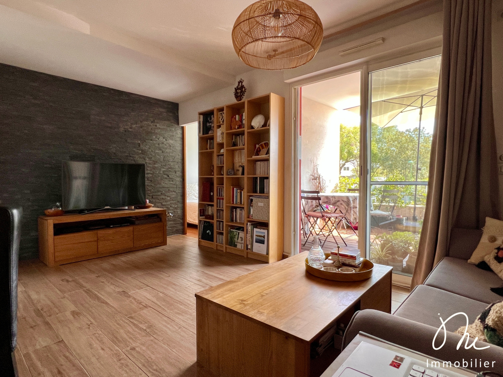 Une baie vitrée vous donne accès à la belle terrasse. Idéale pour profiter de notre climat méditerannéen.