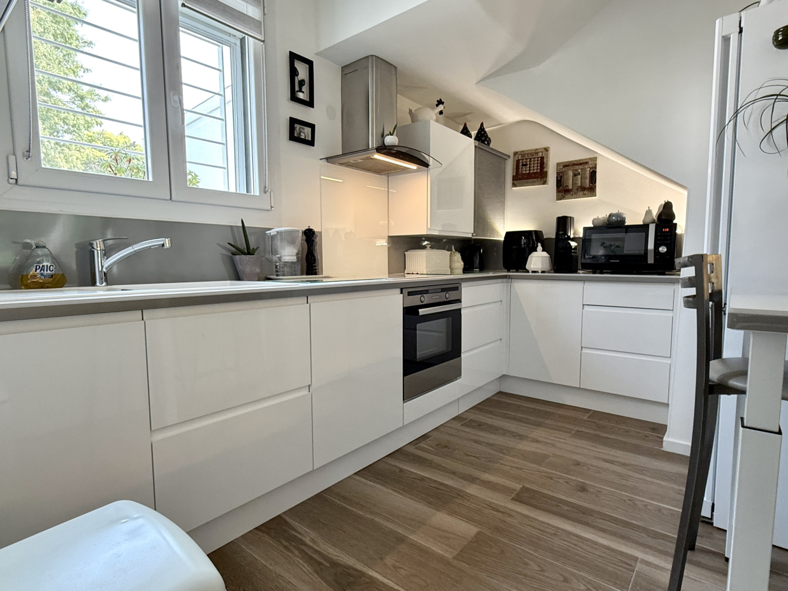 Au rez-de-chaussée, une cuisine contemporaine, un séjour et une salle à manger : fonctionnel et accueillant.