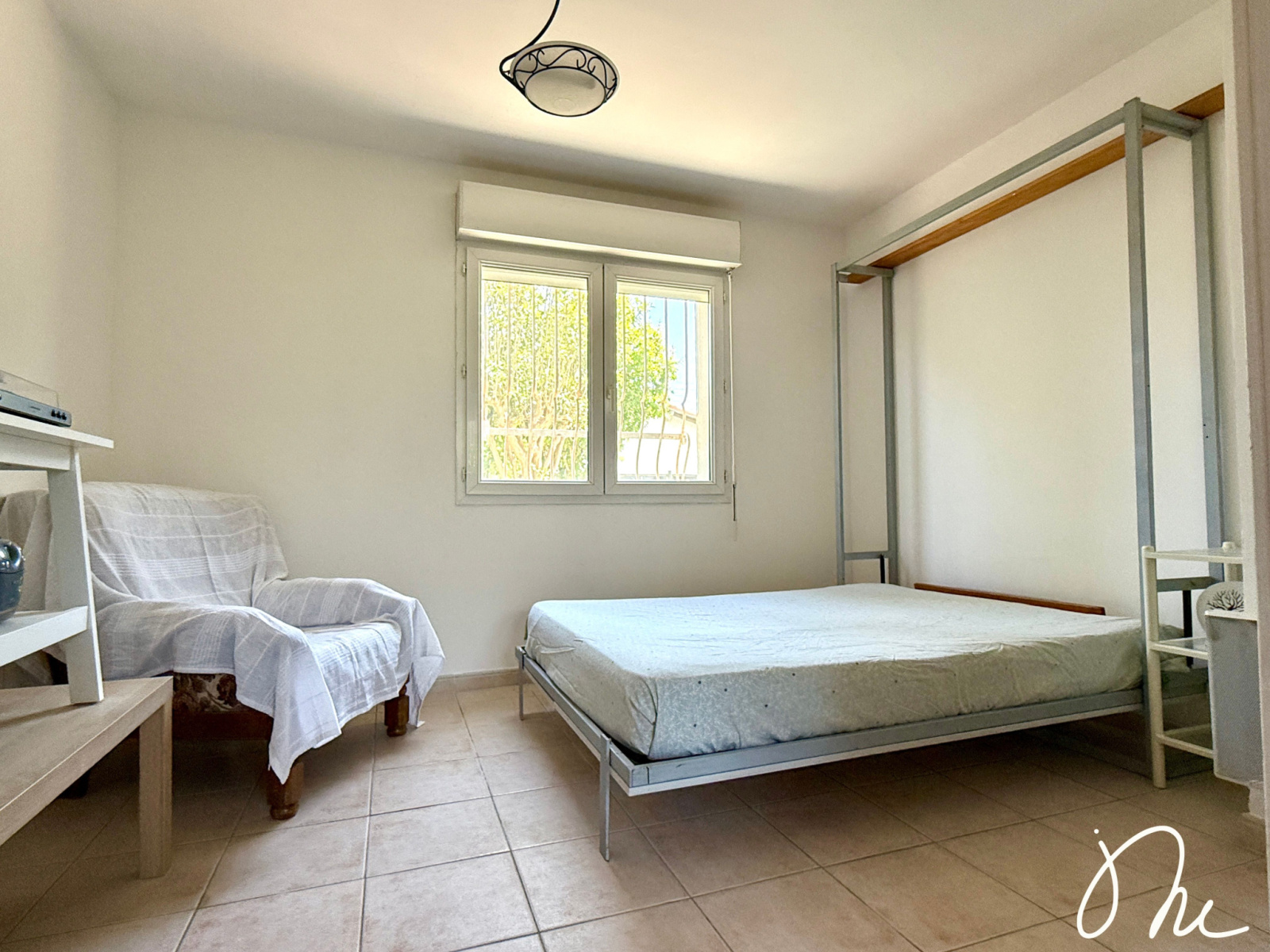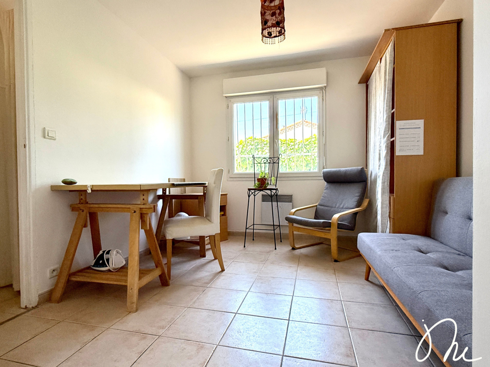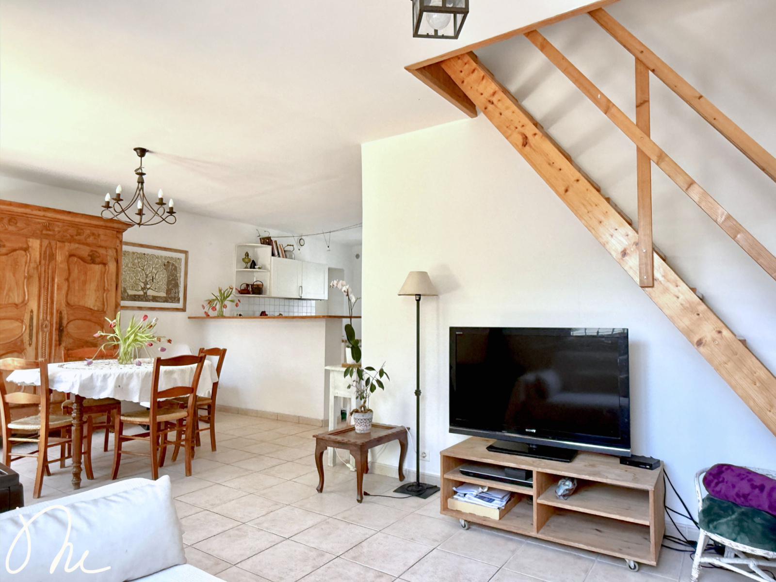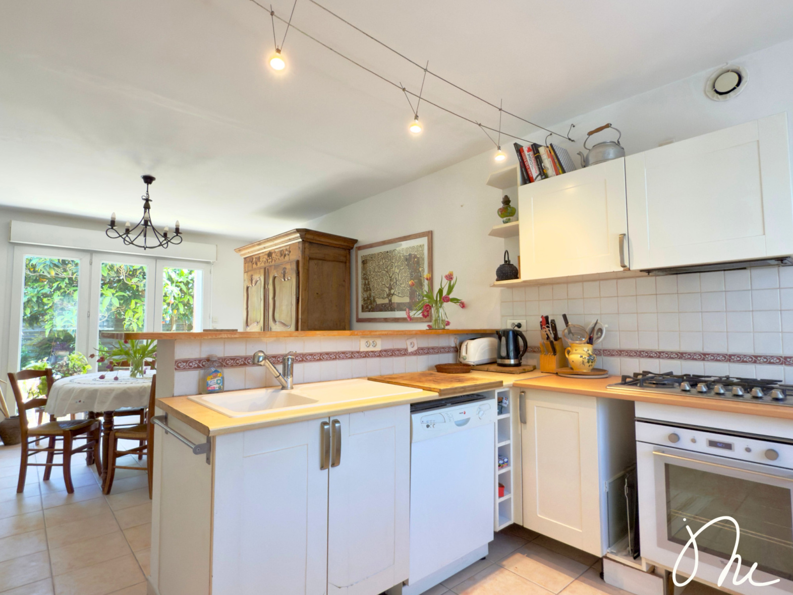 Un séjour traversant avec cuisine ouverte, lumineux, donnant directement sur un jardin planté d’arbres fruitiers et d’essences méditerranéennes.