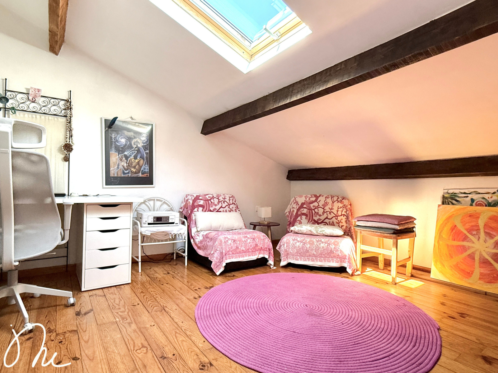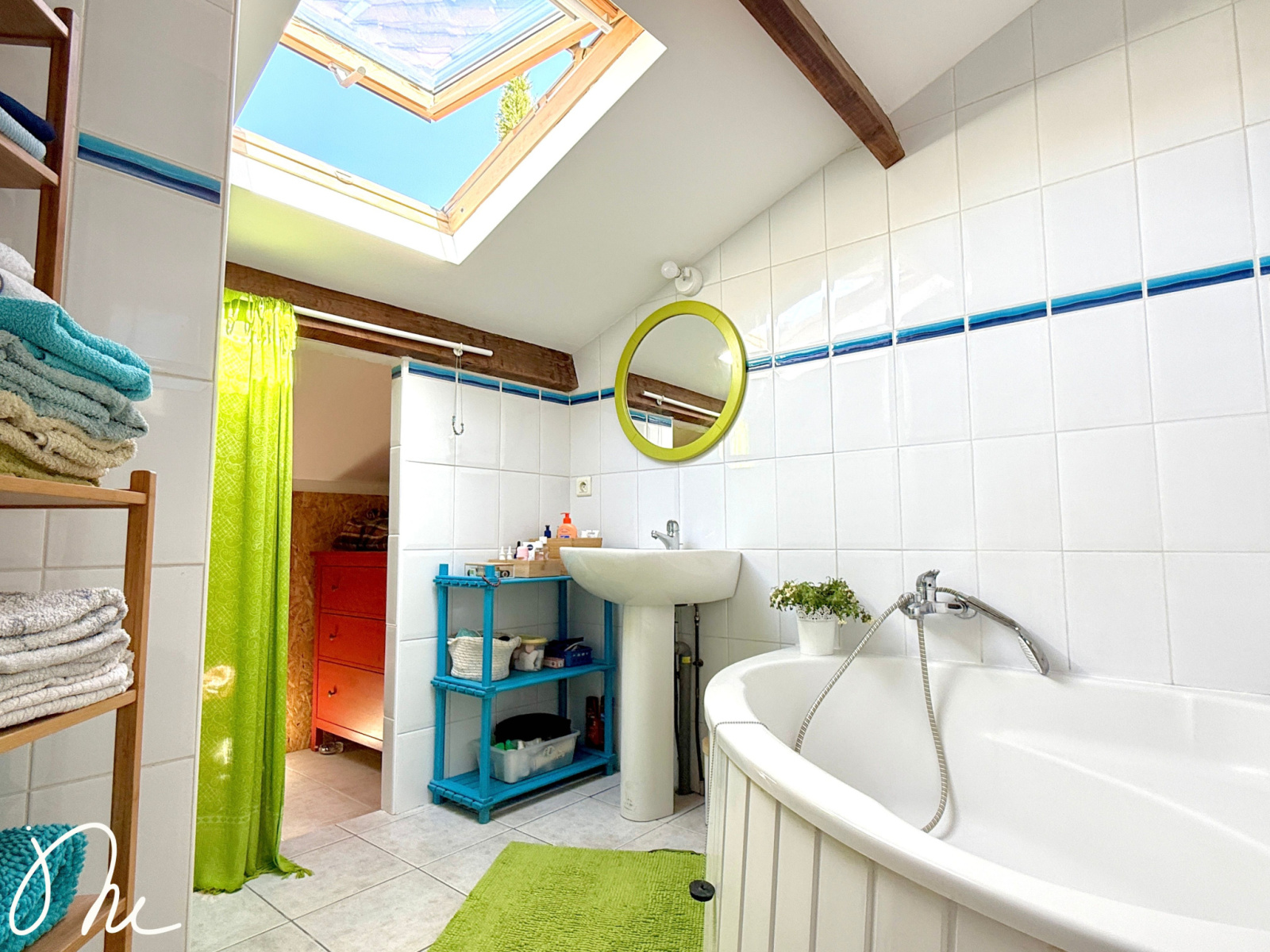 À l’étage : deux chambres lumineuses, un bureau mansardé (12,59 m² au sol), une salle de bains avec WC, et un accès pratique au grenier.