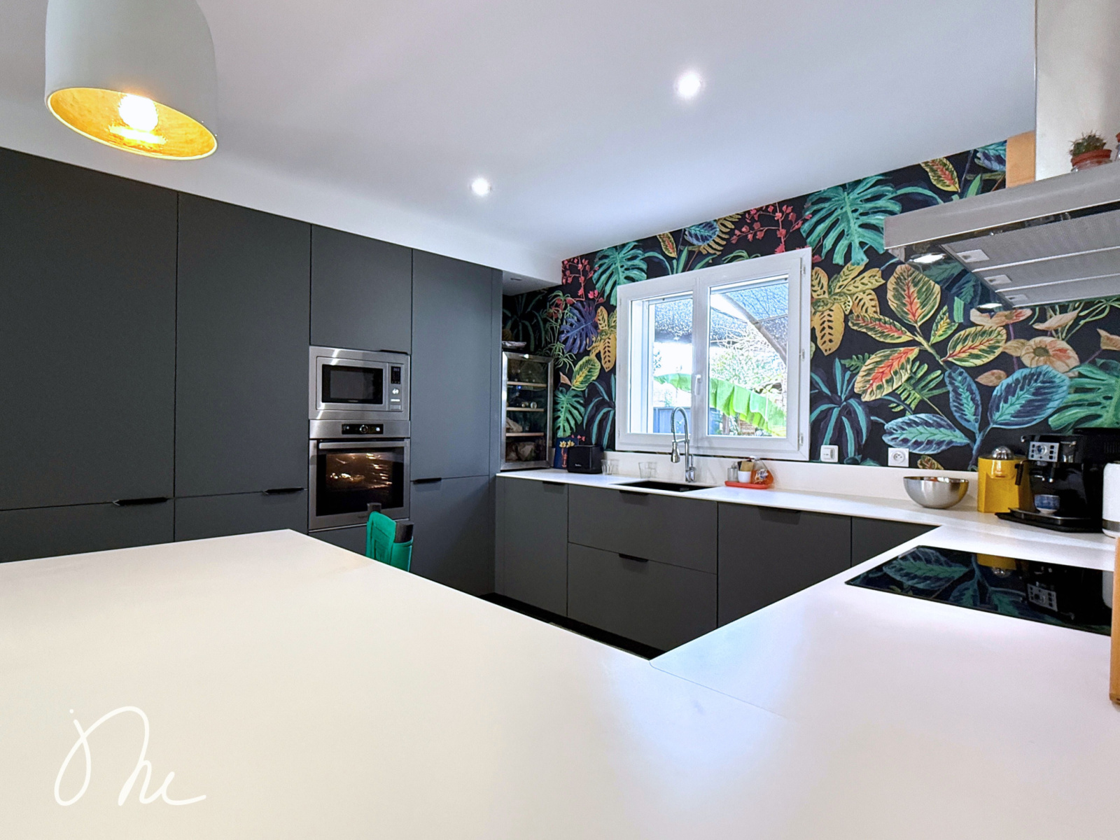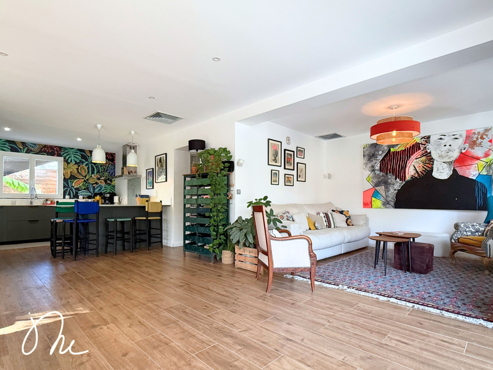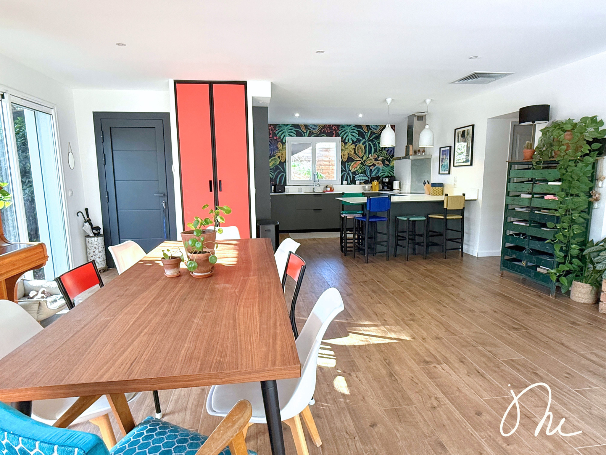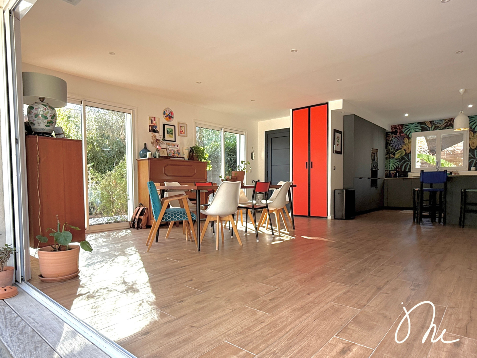 Vous entrez dans une vaste et lumineuse pièce de vie qui s'ouvre généreusement sur le jardin via une baie vitrée à galandage.