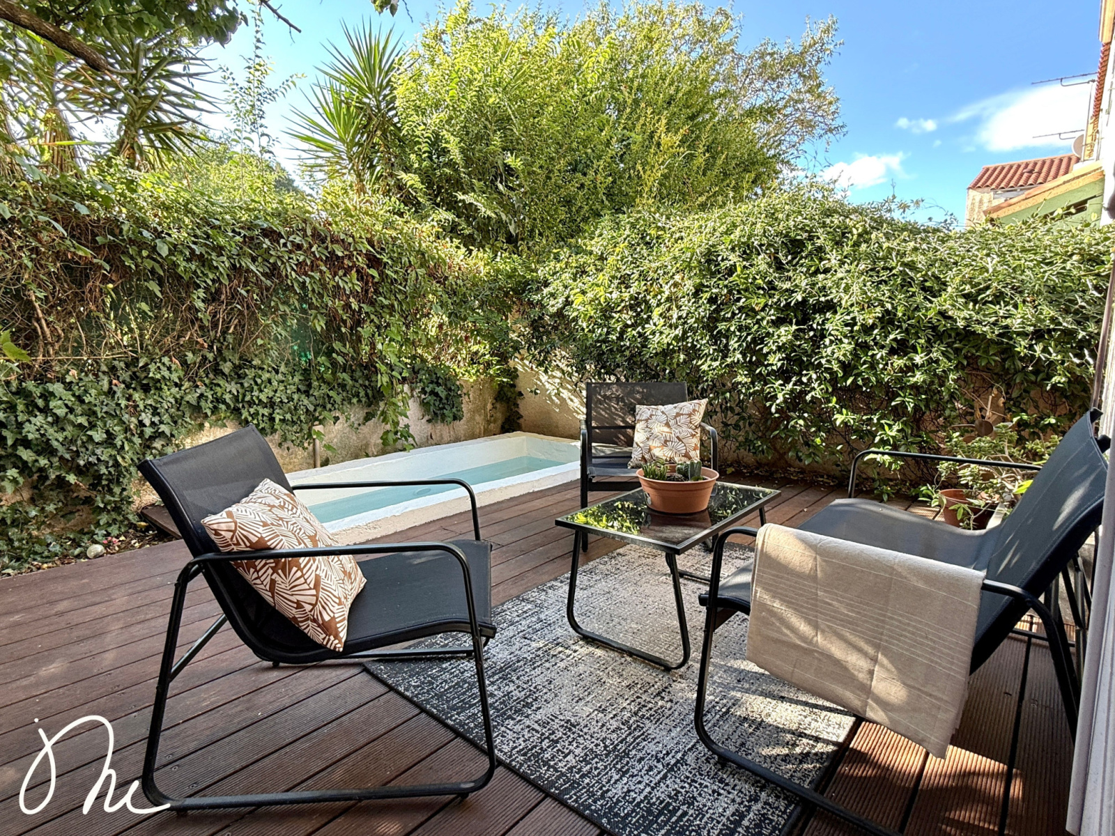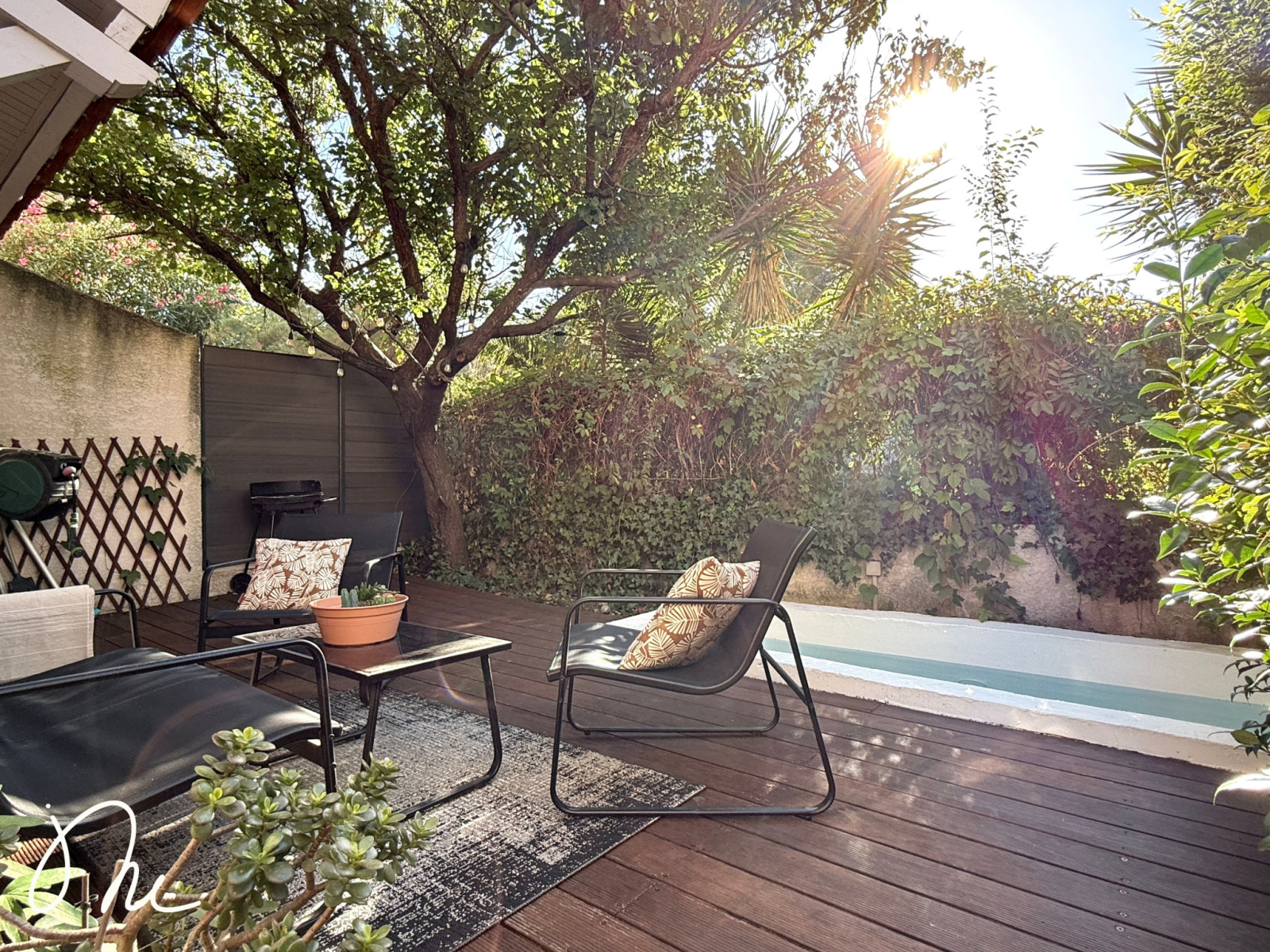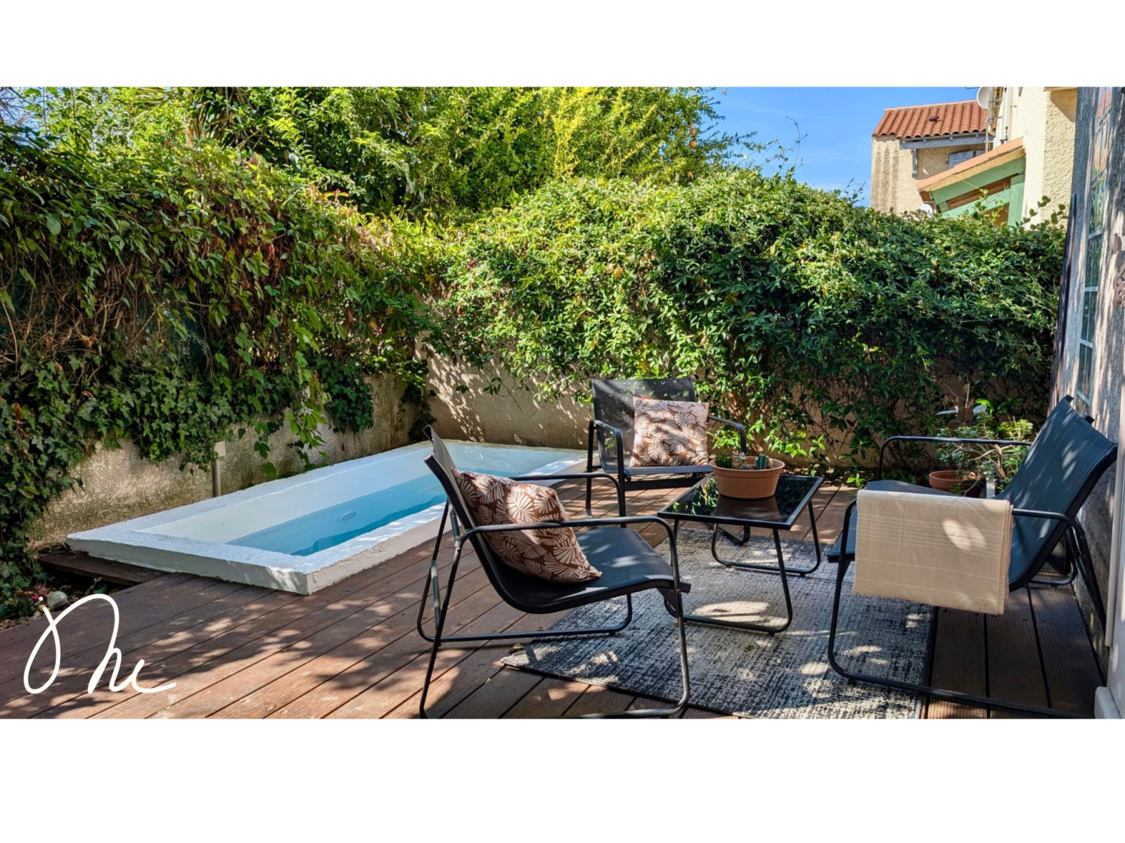 Ses prestations : nombreux rangements, cuisine aménagée et équipée, double vitrage, climatisation dans une des chambres, jardin arboré et petite piscine pour se rafraichir les jours de grandes chaleurs