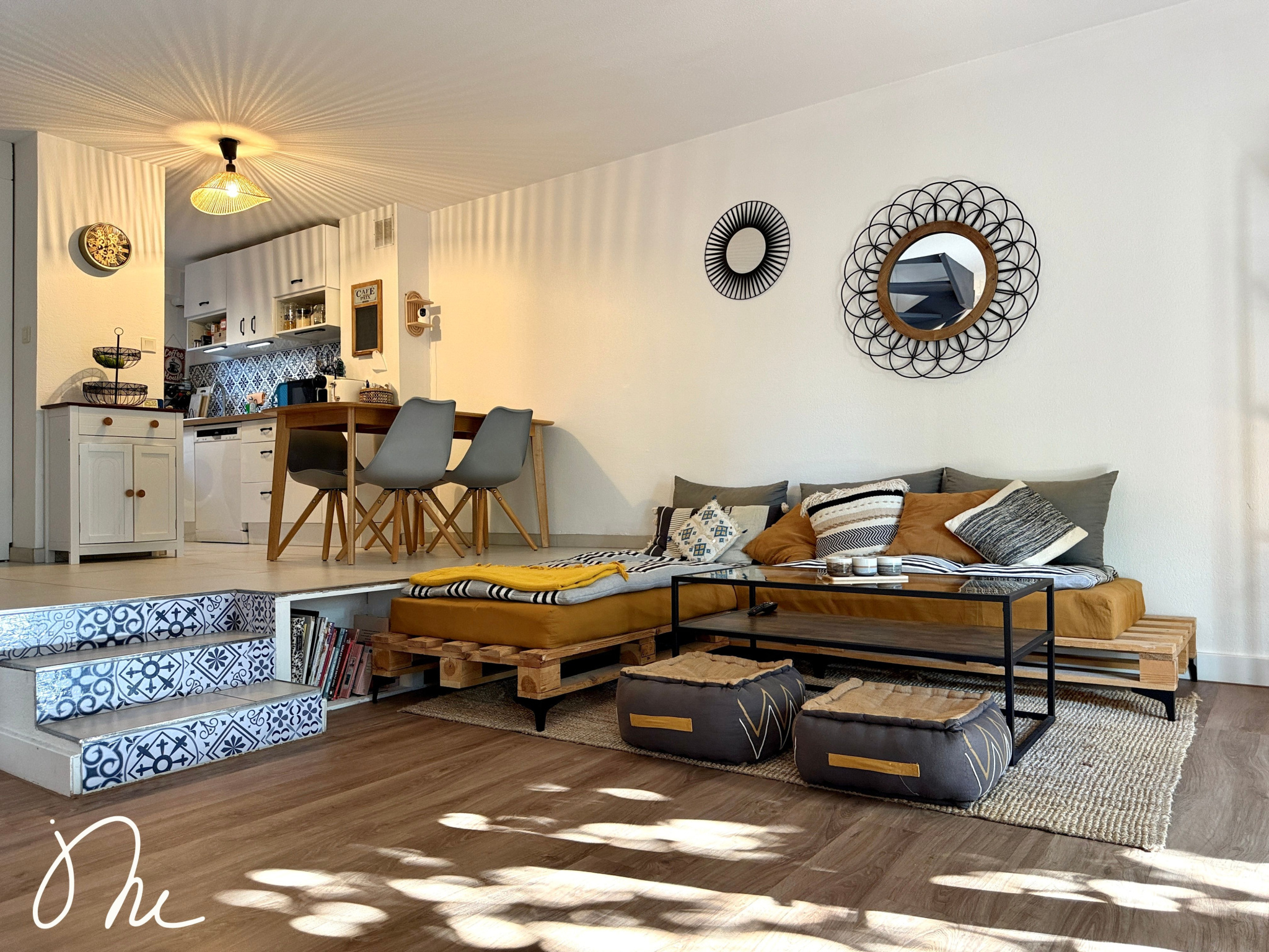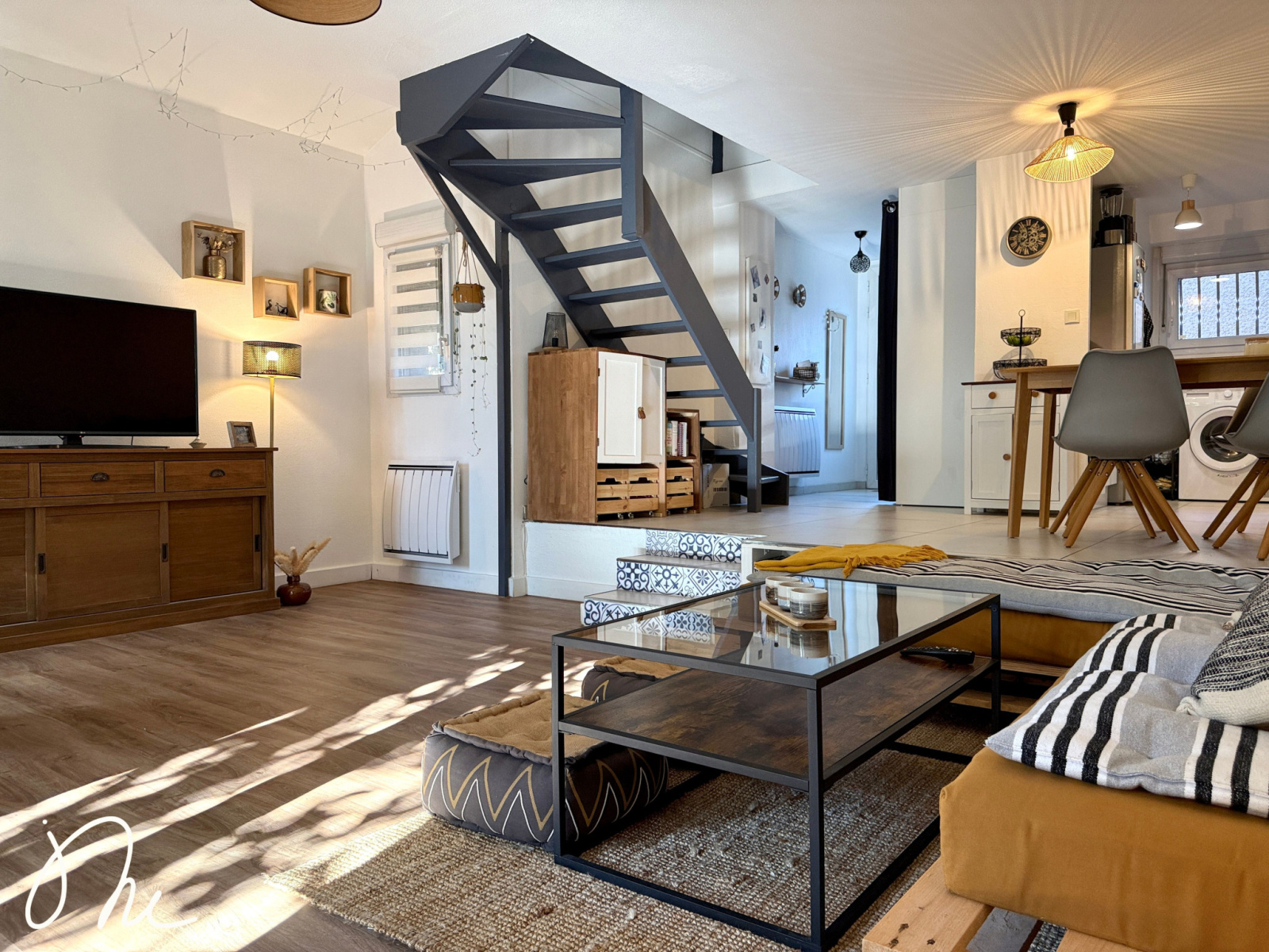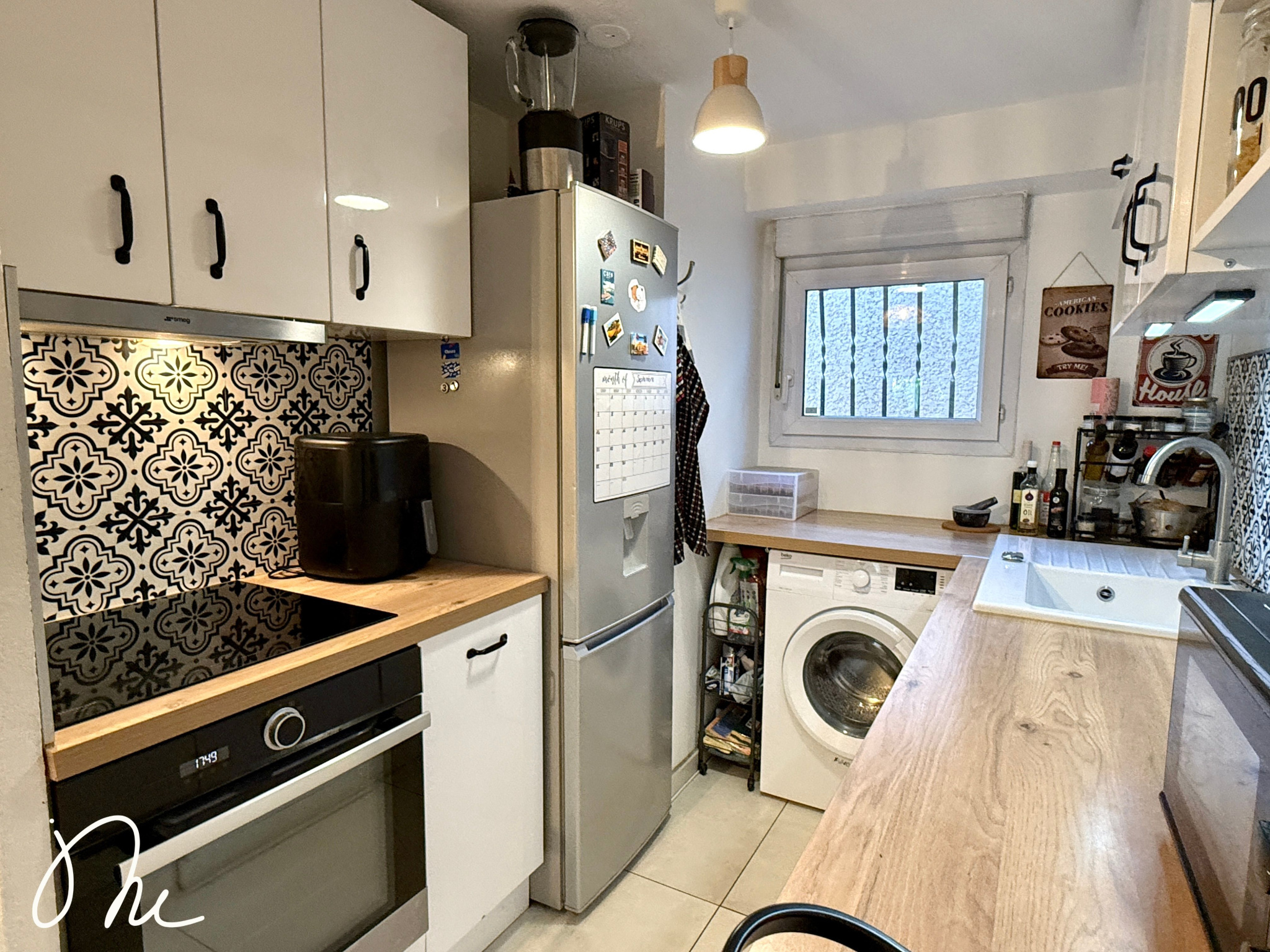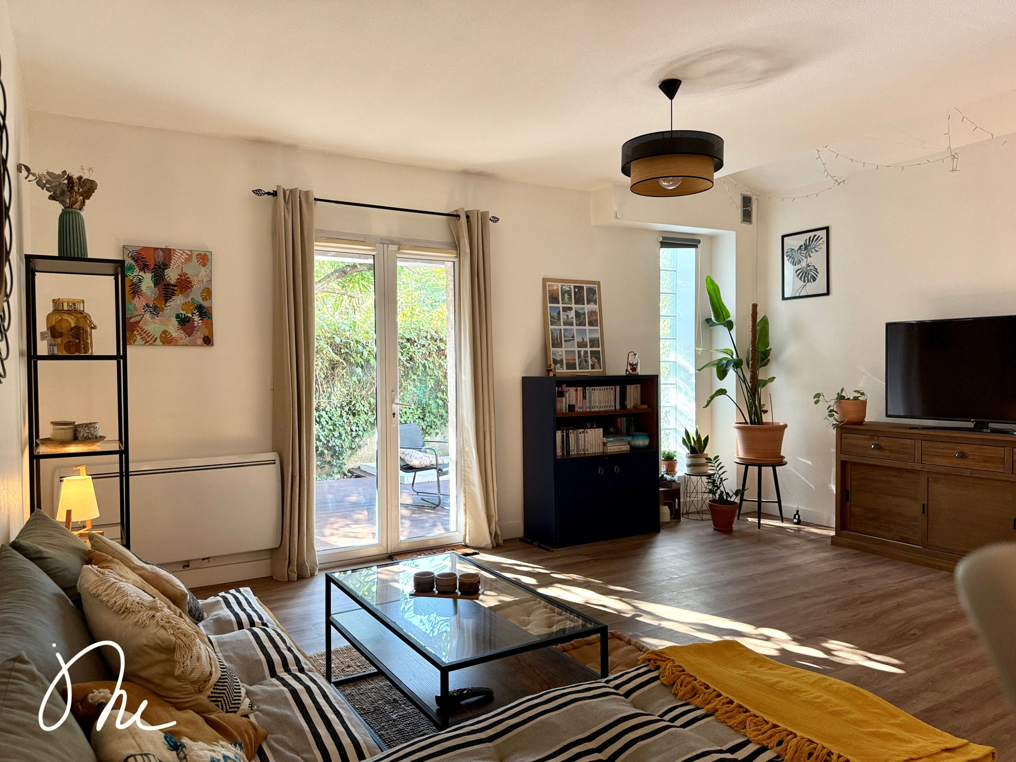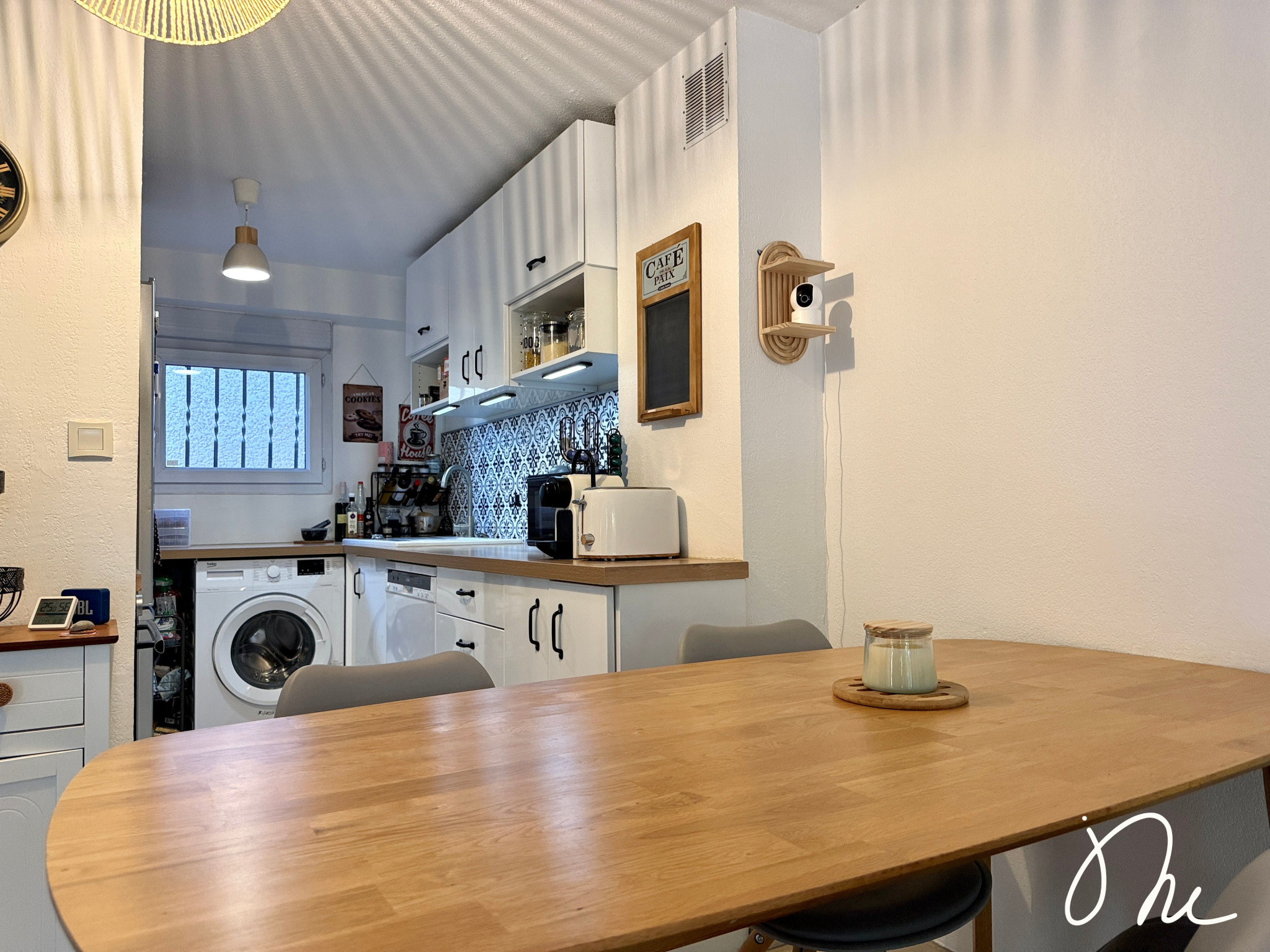 Vous disposez d'une cuisine ouverte, aménagée et équipée, sur un beau salon avec son accès direct à la terrasse et au jardin intime. Aucun vis-à-vis, vous pouvez y vivre tranquillement.