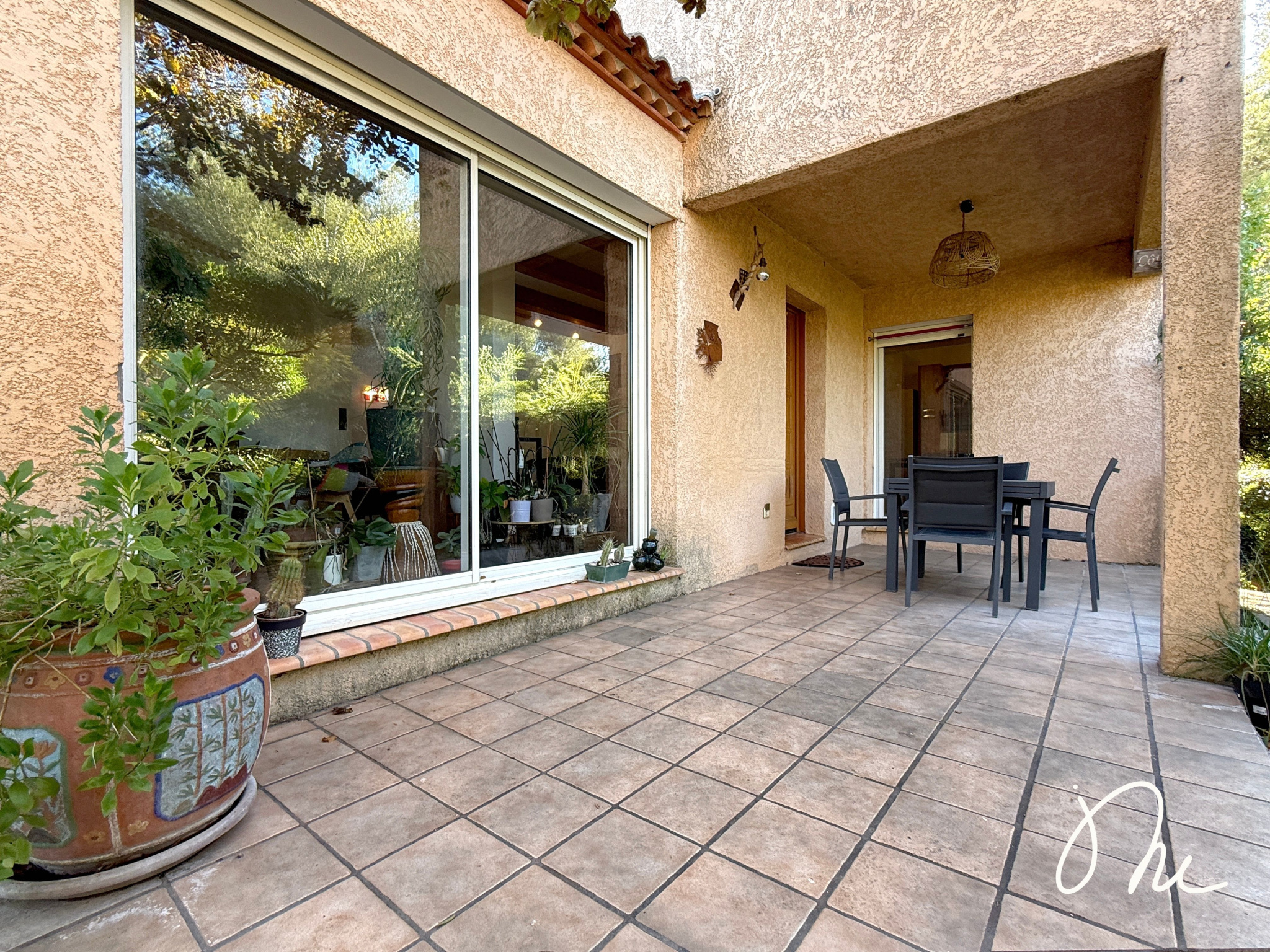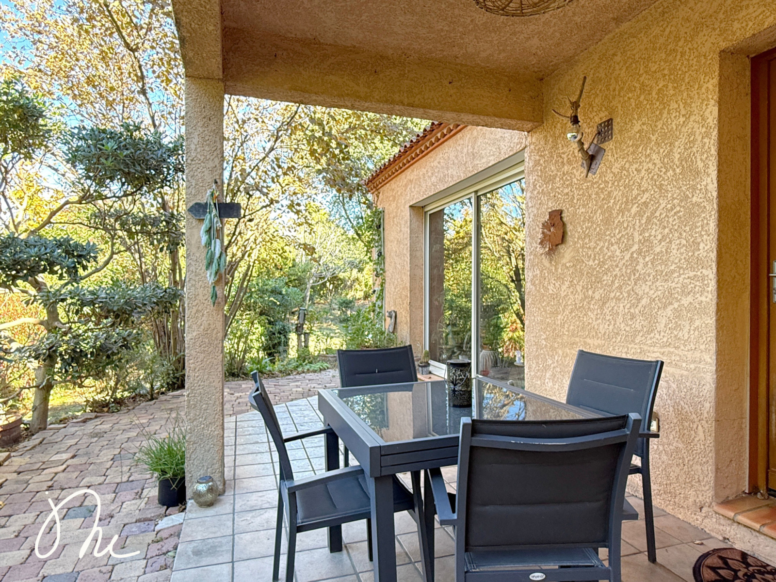 À l'extérieur : un jardin magnifiquement arboré, piscinable et avec 2 terrasses aménagées pour profiter de notre climat toute l'année !