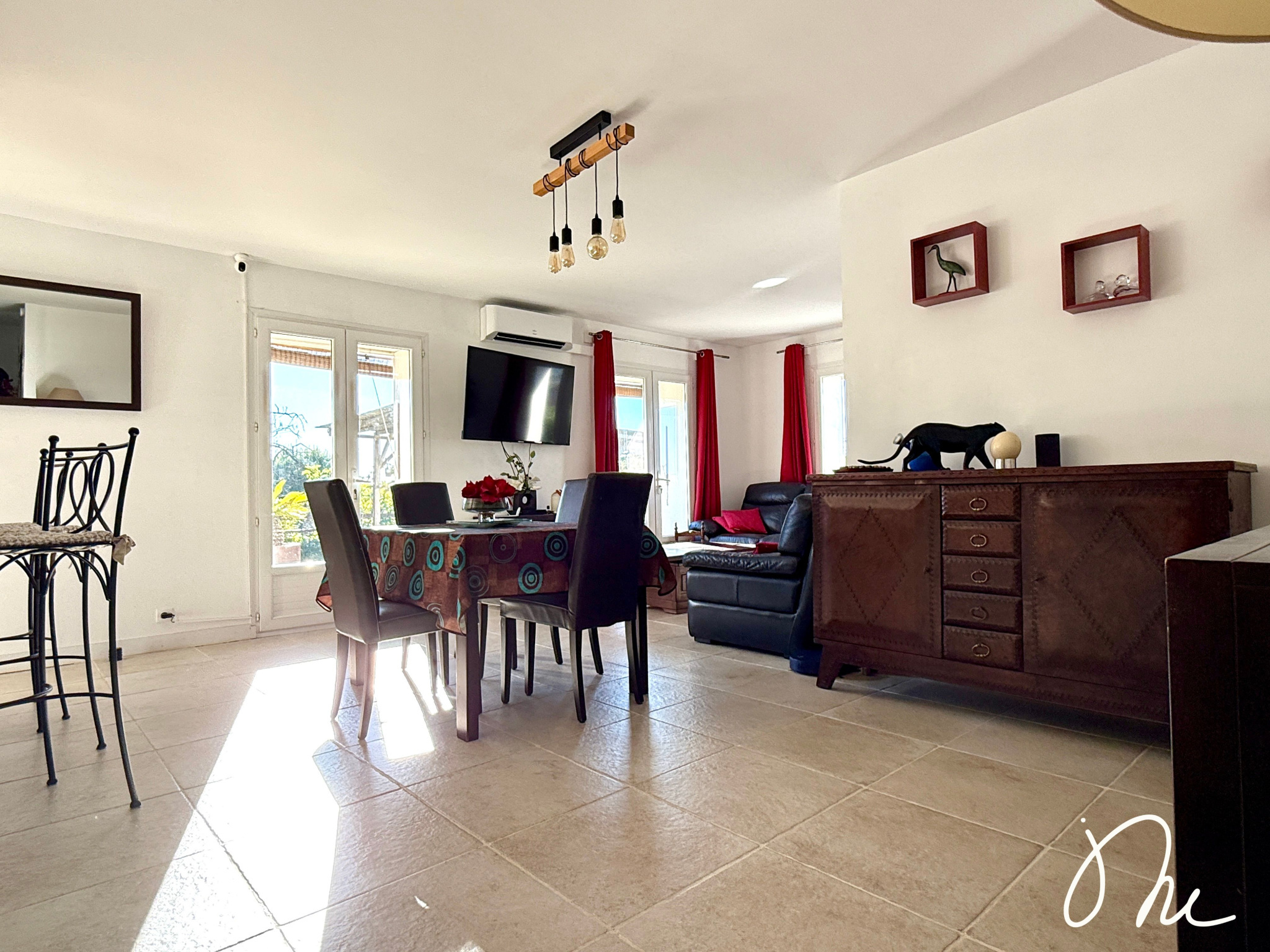Entièrement de plain-pied, elle est très bien agencée avec son entrée qui dessert le grand séjour lumineux et sa cuisine ouverte, aménagée et équipée. Le tout est baigné de lumière avec une exposition sud et donne accès à une grande terrasse bois et une piscine enterrée au sel.
