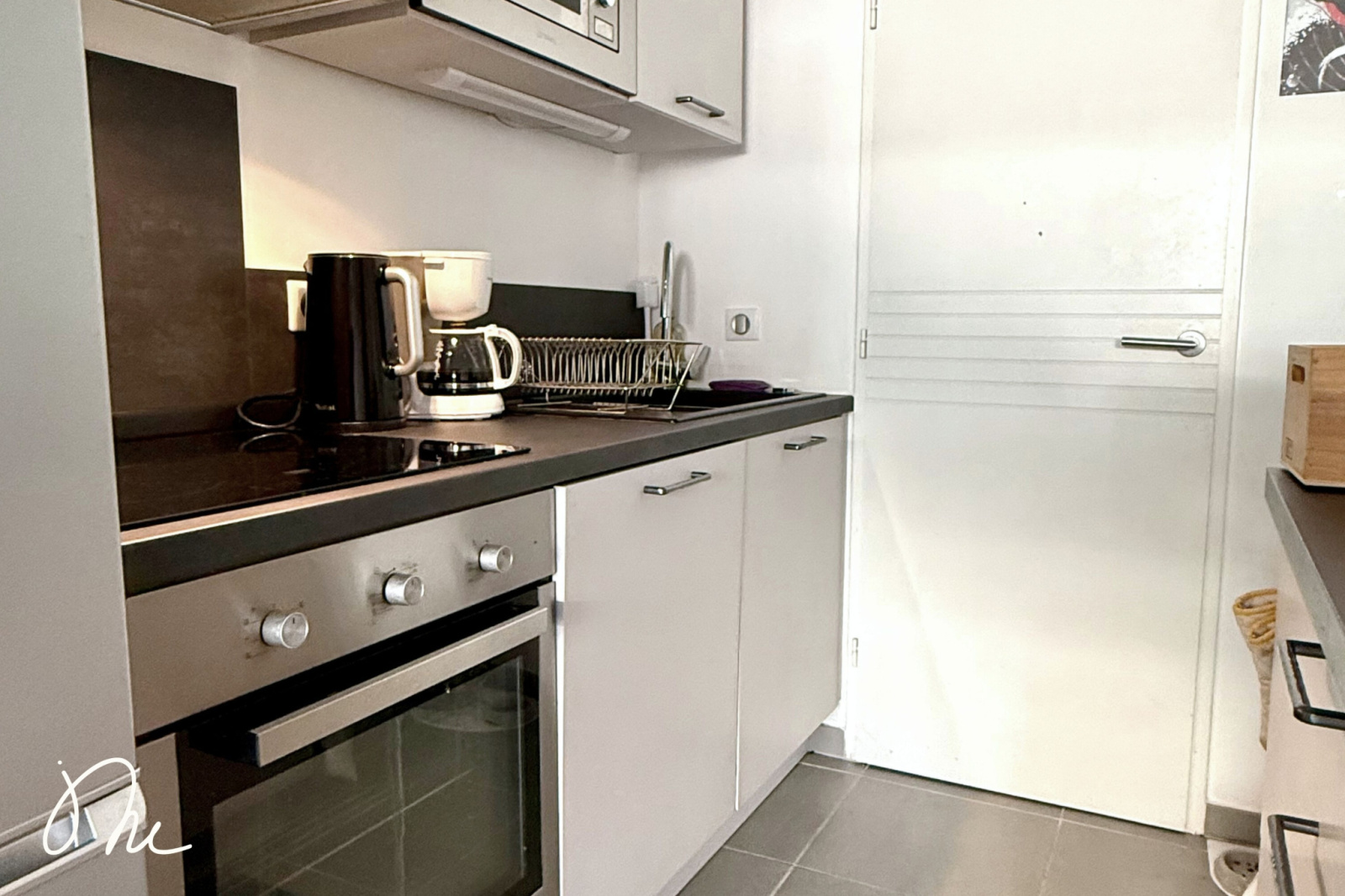 Vous entrez dans une pièce de vie avec cuisine ouverte, aménagée et équipée et un espace buanderie