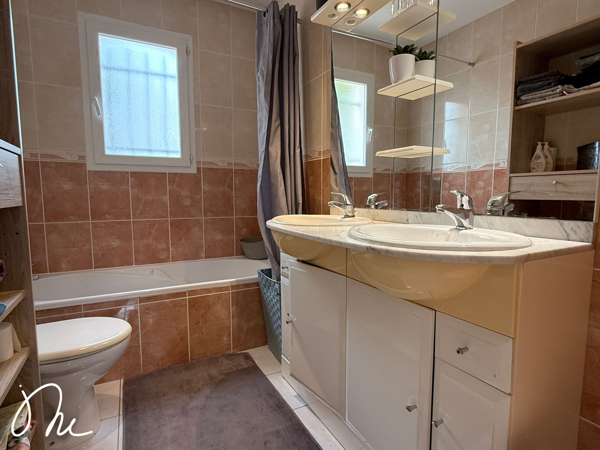 À l’étage, deux chambres supplémentaires et une salle de bains ( avec wc ) accueillent le reste de la famille ou les invités.